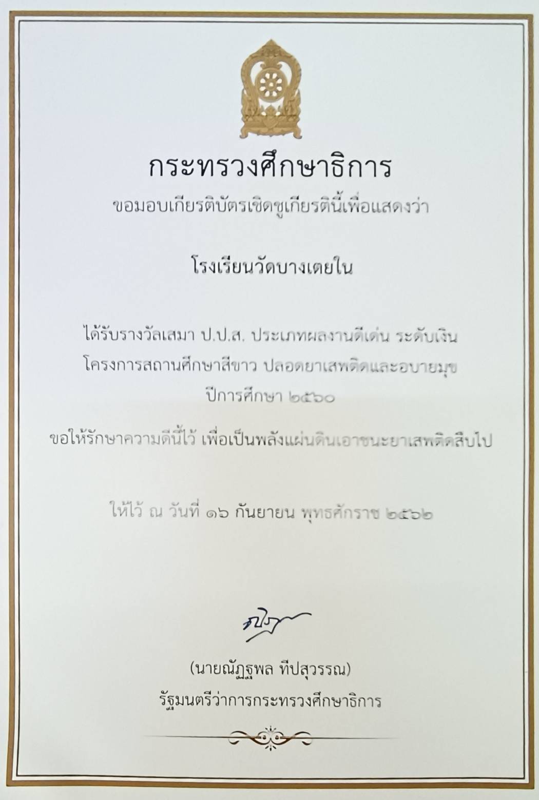 สถานศึกษาสีขาว ปลอดยาเสพติด และอบายมุข ระดับทอง