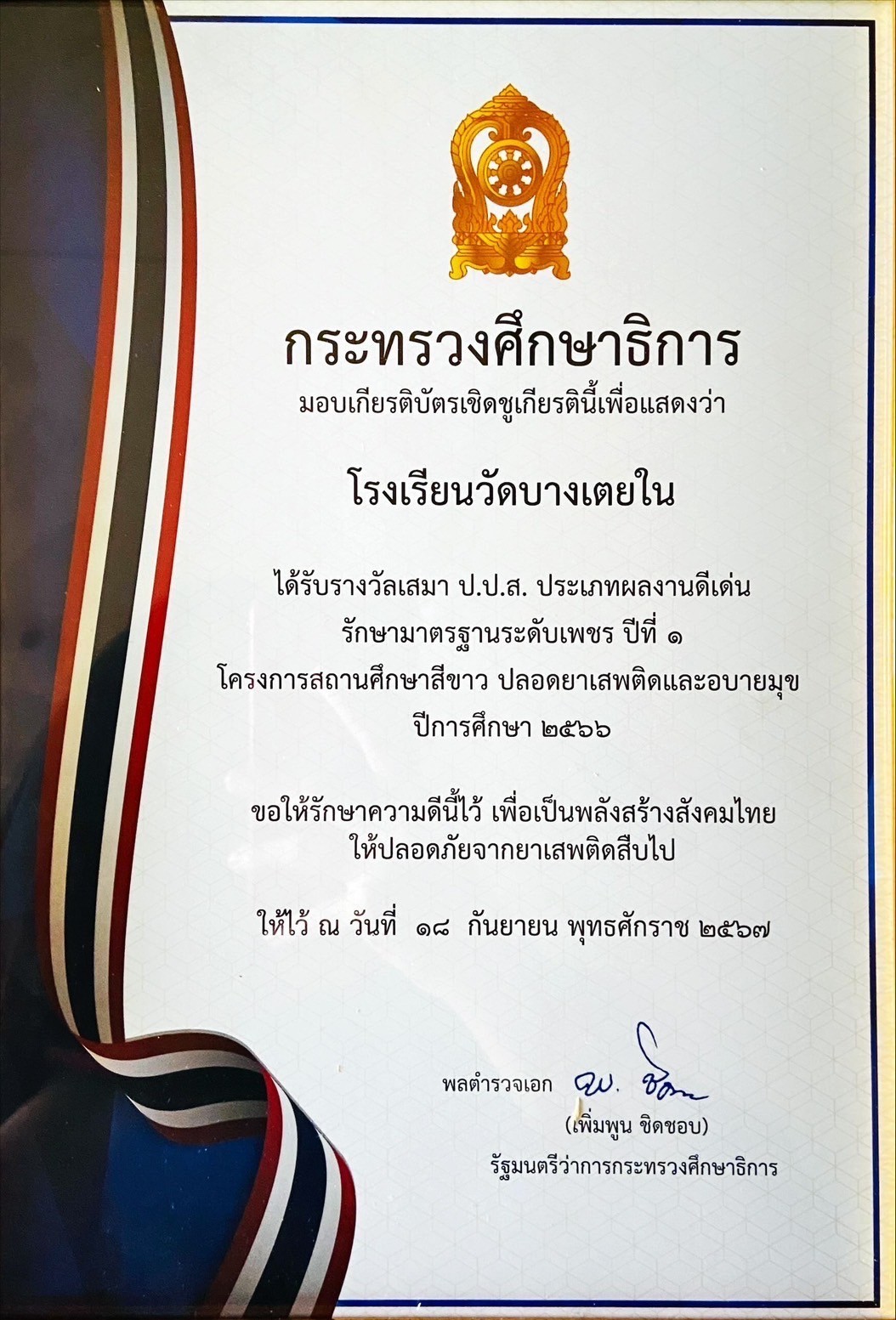 สถานศึกษาสีขาว ปลอดยาเสพติด และอบายมุข ระดับเงิน